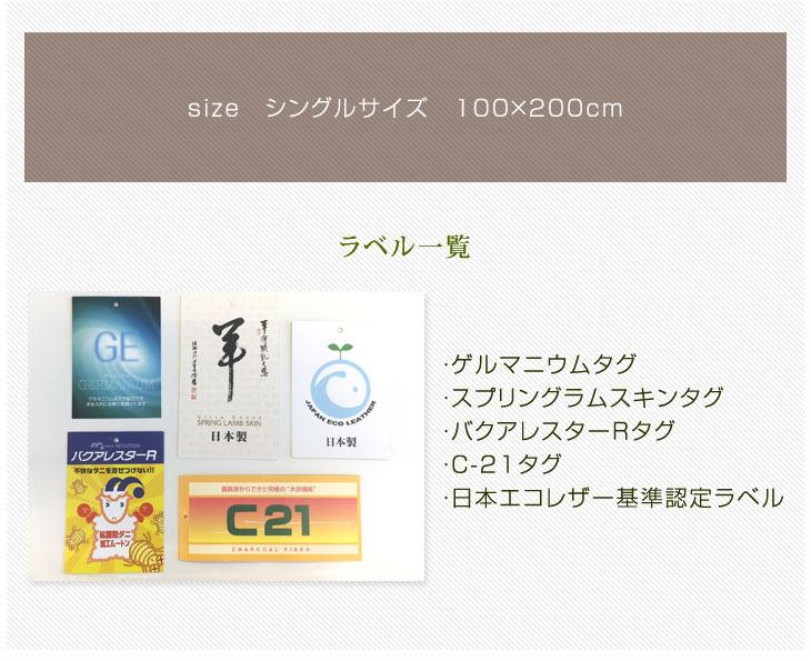 ▼サイズ違いはこちら▼ セミダブル ダブル 仕様 サイズ 100×200cm(シングルサイズ) 【スタッフひーちゃんのおすすめポイント!】 ・オーストラリア ヴィクトリア州で育った羊から作られた高品質ムートンシーツ ・一度も毛狩りをしていない生後約3〜5ヶ月のアンショーンラムのみを使用 ・1㎠5000本の超高密度で高い体圧分散性とへたりにくさ ・アンショーンラムの中でも日焼けによる傷みが少ないスプリングラム100% ・天然羊毛ならではの優れた弾力・冬暖かく、夏涼しいオールシーズン快適・クロムなめし加工で高い耐久性・繊維1本1本に抗菌・防ダニ効果を持たせるバクアレスターR・優れた温熱・放熱・消臭の木炭繊維C-21・マイナスイオンを生成するゲルマニウム 素材 スプリングラムスキン100% ( オーストラリア・ヴィクトリア州産) 生産国 日本 備考 ※天然物のため、サイズには個体差がございます。