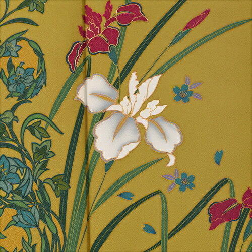■0532-39-7660 標準サイズ 身長・・・155cm〜170cm位 洋服サイズ・・・7号〜11号位まで 商品説明 こくの有るからし地にあやめをすっきりと描き青緑の草花模様とあいまってどこかエキゾチックな華やぎを放す訪問着です。