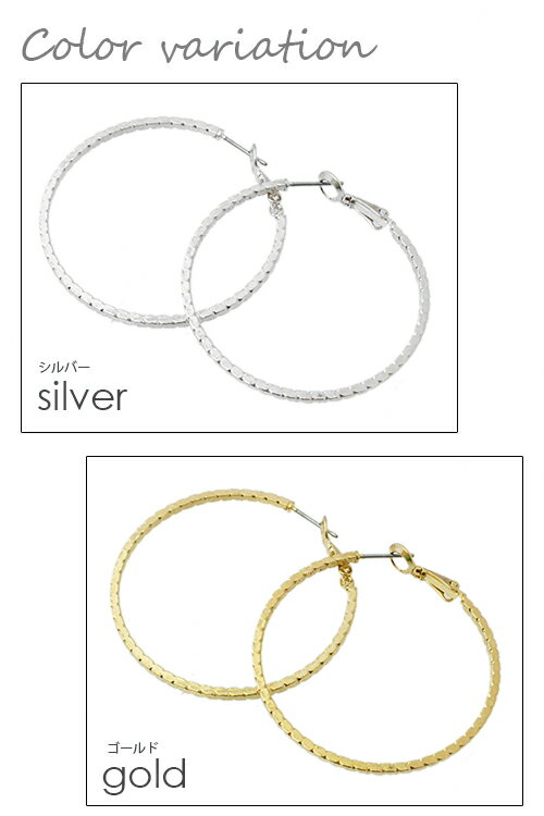 ギフト対応素材:真鍮製 ニッケルフリー プラチナロジウムコーティングゴールドコーティング フープピアス バネ式 サイズ:全長:直径約4cmリング幅サイズ:約4mmポストの長さ:10.0mmポストの太さ:0.7mm 定番ピアスのフープにデザインをプラス。
